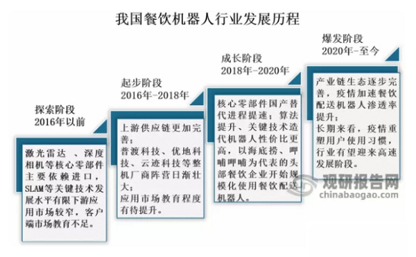 送餐机器人是餐饮业的重要驱动力,主要作用就是作为机器人服务员完成餐厅里的工作,通过融合应用自主移动、环境感知、底盘、语音识别、智能芯片、多机调度等关键技术,实现自由移动、协同运作、全面感知的新发展能力。而餐饮机器人的发展应用可分为4个阶段。目前已经进入了第四阶段——即爆发阶段:以海底捞、全聚德、外婆家等头部餐饮品牌已经开始大规模使用送餐机器人,产业链生态也逐步完善,疫情加速餐饮机器人渗透率提升,行业已经迎来高速发展阶段。