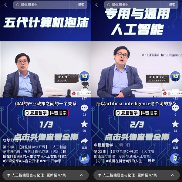 打开抖音,大家会有一种放松的心态。我也是。我是学哲学的,也不会一天到晚看辩论赛或者烧脑的节目。有时候我会打开视频,看美食节目,看人家怎么炒菜吃。我现在有个想法,你在放松的时候,有哲学短视频可以选择,看完了你能得到一些知识,或者一些启发,掌握一些小的论证,这我觉得就很好。