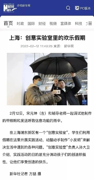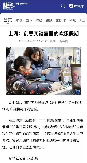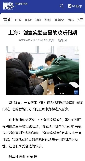 新华网报道了宋庆龄少年儿童发明赛中ideaLab的寒假营项目,“上海:创意实验室里的欢乐假期”。