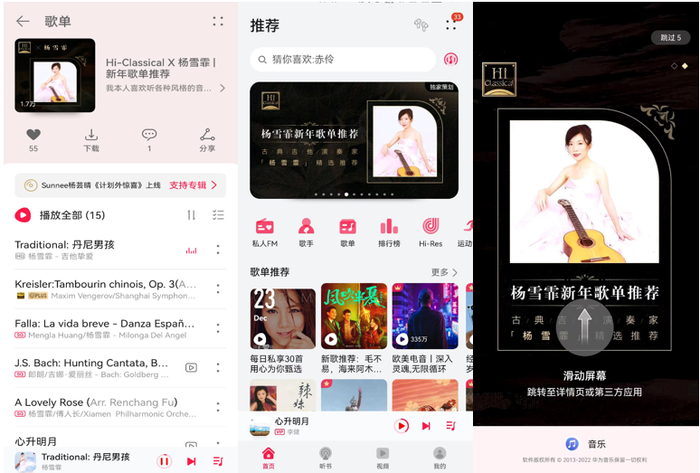 有人说,杨雪霏天生就是为音乐而生,很小的时候就与古典吉他乐结缘,并展露天分,每一场表演都诠释了她灵动的艺术才能,几近完美的演奏技巧和灵敏的音乐触觉。而在华为音乐的Hi-Classical专区,你不仅能听到杨雪霏老师最新的吉他作品,还能重温她演绎的经典佳作。随着新年的到来,杨雪霏新年歌单现已上线华为音乐Hi-Classical专区,歌单曲目均由杨雪霏老师本人亲自挑选与专业推荐,通过联合歌单形式,向用户推荐了众多优质古典经典佳作,资深乐迷可以重温那些令人着迷的悠扬妙音,新乐迷也能爱上这种优美的旋律。