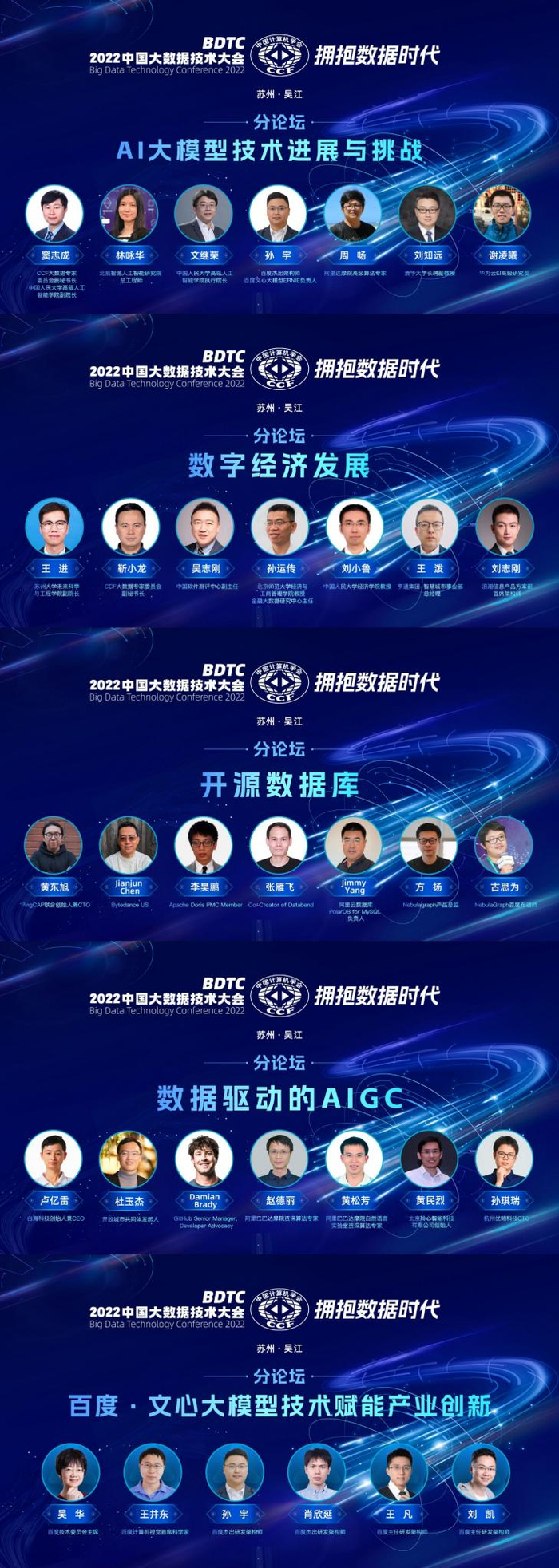 1月8日下午,由苏州市人民政府指导、中国计算机学会主办、苏州市吴江区人民政府支持,CCF大数据专家委员会、苏州市吴江区工信局、吴江区东太湖度假区管委会、苏州市吴江区科技局、苏州大学未来科学与工程学院及DataFounain数联众创联合承办的第十六届中国大数据技术大会“AI大模型技术进展与挑战”、“数字经济发展”、“开源数据库”、“数据驱动的AIGC”、“百度·文心大模型技术赋能产业创新”五大专题技术与行业系列分论坛同步举办。