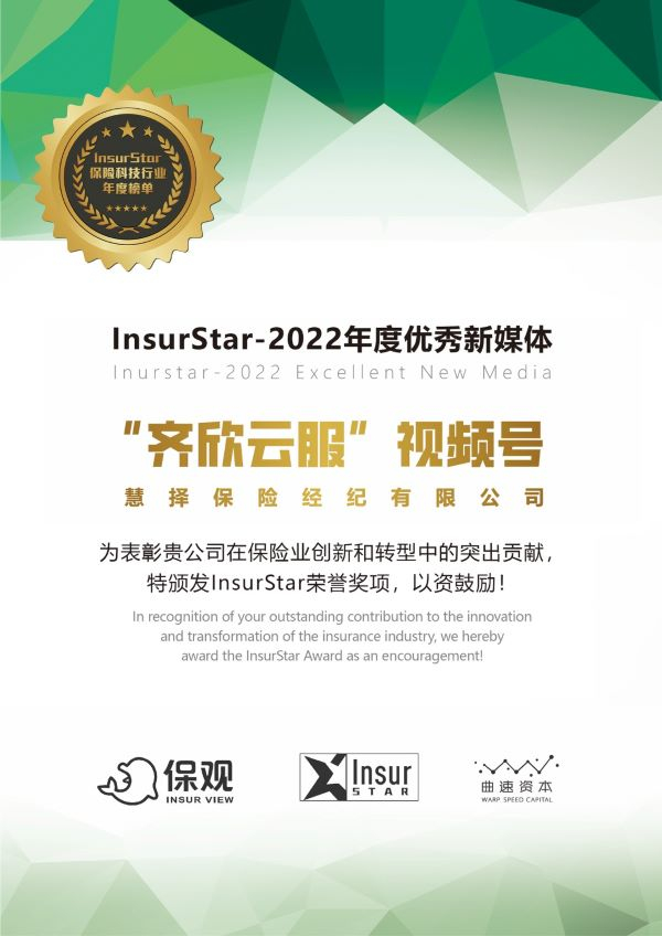 齐欣云服视频号获”InsurStar-2022年度优秀新媒体“奖项,内容运营双双获行业认可