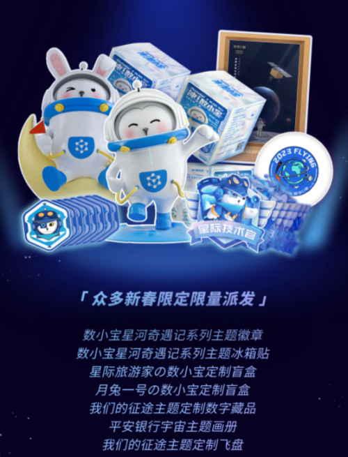 近期,平安数字口袋2022年年度账单温暖上线,查询2022年年度账单,即可获得数小宝星河奇遇记系列主题徽章、数小宝星河奇遇记系列主题冰箱贴、星际旅游家の数小宝定制盲盒、月兔一号の数小宝定制盲盒、我们的征途主题定制数字藏品、平安银行宇宙主题画册等兔年精美礼品。