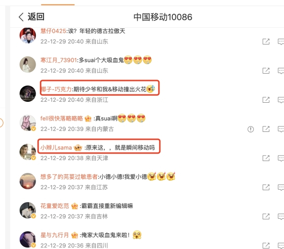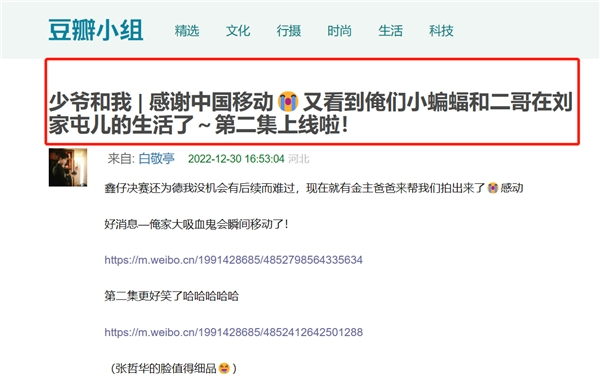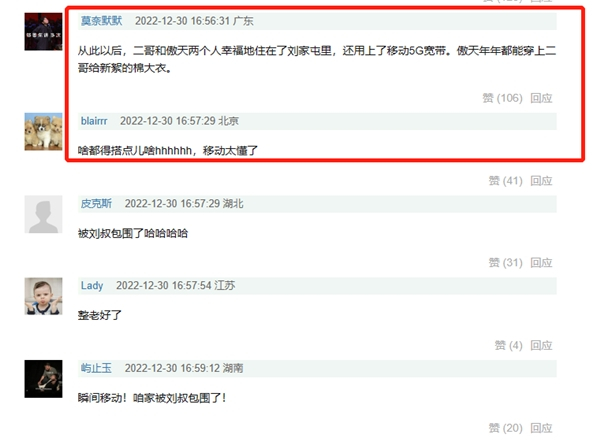 两支短片作为中国移动家庭业务年轻化传播的一次新尝试,让社会化营销更能满足当下年轻人对于娱乐内容的需求,通过微博平台为大家带来刘波宇宙“纯享版”后续。在互动评区中,中国移动也赢得年轻受众的广泛好评。鑫仔和张哲华的转发互动也扩大了话题传播性,两位演员的粉丝将中国移动植入到剧中金句,形成“不是三十秒不是十秒不是两秒,瞬间中国移动”的融梗,更是蔓延到豆瓣、抖音等多个平台,粉丝们脑洞大开,将剧中“瞬间移动”的剧情设计与“中国移动”品牌两个概念关联到一起,作为新的社交货币。中国移动跟进年轻人喜欢的热点,选择喜剧营销的方式对话年轻人,在输出品牌信息的同时提供了更为独特的价值,成功撬动流量密码。让参与到这场“共嗨式”传播的粉丝成为自来水,为传统家庭市场业务的破圈增长打破更多壁垒。