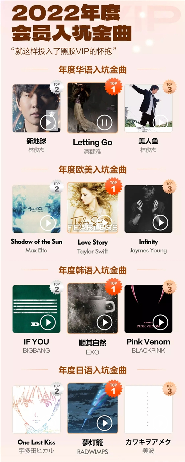 在2022年度会员入坑金曲部分,分为华语、欧美、韩语、日语四个部分。2022年,会员华语入坑金曲为蔡健雅《Letting Go》、林俊杰《新地球》《美人鱼》;会员欧美入坑金曲为Taylor Swift《Love Story》、Max Elto《Shadow of the Sun》、Jaymes Young《Infinity》;会员韩语入坑金曲为EXO《顺其自然》、BIGBANG《IF YOU》、BLACKPINK《Pink Venom》;会员日语入坑金曲为RADWIMPS《夢灯籠》、宇多田ヒカル《One Last Kiss》、美波《カワキヲアメク》。会员年度入坑金曲体现了2022年新晋成为黑胶会员的云村用户品味,对品质音乐的偏好促使更多用户成为专享丰富高品质音乐内容的黑胶会员用户。