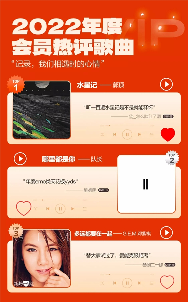 会员热评歌曲记录了黑胶用户每一个共鸣时刻,郭顶的《水星记》成为2022年最受热评歌曲,队长《哪里都是你》、邓紫棋《多远都要在一起》也记录了海量云村用户的热评时刻。陈奕迅《孤勇者》成为2022年黑胶会员年度爱搜歌曲,有黑胶会员评论这首歌让“每个年龄段有不同的理解”。