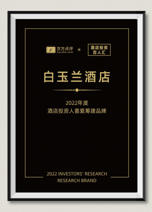 2023年1月10日,由次方点评&住联咨询主办的【答案与方向:中国酒店及住房租赁产业投资年度报告大课堂&结业礼】在杭州·浙江世贸君澜大酒店圆满落幕。白玉兰品牌再度斩获2022年度投资人喜爱筹建品牌,白玉兰酒店获此殊荣,是市场对其商业价值的肯定也突显“用心 为你更好”的服务理念。