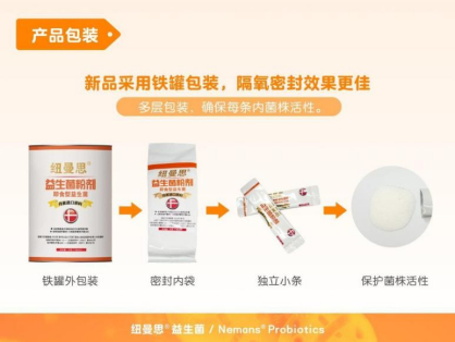 而且为了保障运输储存过程中的安全性,纽曼思即食益生菌的新品全面采用了铁罐包装,隔氧密封效果更佳,内部更是进行了多层保护,有效确保了每条产品内菌株的活性,每条产品均内含以动物双歧杆菌Bb-12、鼠李糖乳杆菌LGG为优势双菌株的45亿活菌,并特别添加益生元成分,以更好地提高身体免疫力。
