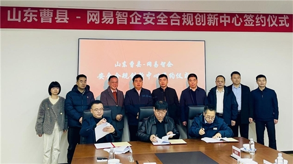 2023 年 1 月 10 日,数字内容安全合规创新中心建设暨战略合作框架协议签约仪式在杭州举行,山东曹县县委书记赵福龙和网易智企副总裁、网易易盾总经理朱浩齐等共同出席并讲话。曹县县委办公室主任李松、曹县开发区党工委书记主任陈先忠 、曹县青菏街道党工委书记王楠、曹县林业服务中心主任兰涛、曹县招商服务中心主任邵长民参加。