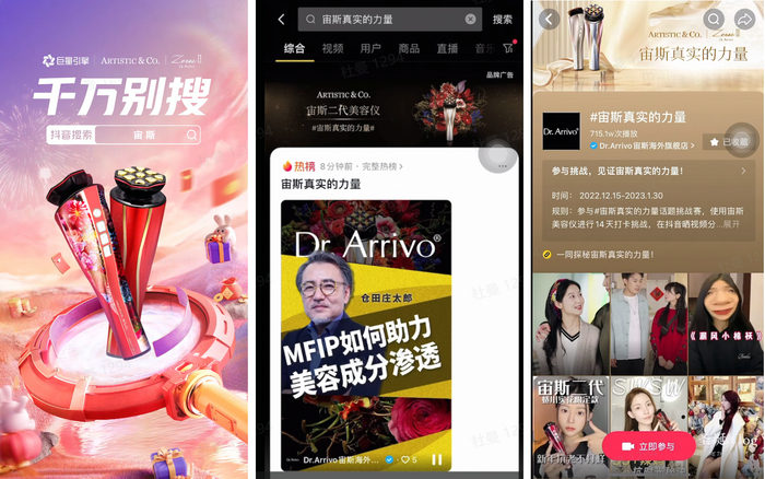 其次,用户在刷视频的过程中,如果被「千万别搜」激发起兴趣,主动搜索“宙斯”相关内容,或者当看见抖音热榜“宙斯真实的力量”话题,好奇点进去时,也会解锁更多品牌信息。此时,搜索便成为了用户深度接触品牌的桥梁 。用户通过搜索进入品专,了解更多品牌信息,并参与品牌精心打造的话题,在这个过程中,搜索顺利打通了用户从认知、兴趣到种草的过程,并为后续转化带来了更多精准流量。