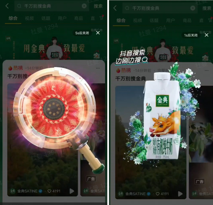 配合「千万别搜」“反向种草”的活动创意,广大用户按捺不住好奇心纷纷尝试搜一搜,这样既扩大了金典在抖音的曝光,也有效勾起了用户主动搜索品牌的意愿。当然,令人眼前一亮的搜索彩蛋只是这次金典与「千万别搜」联动营销的一部分,通过串联抖音开屏、热点品专等不同渠道触点,金典更探索出了互动链路多样的启发式搜索玩法。