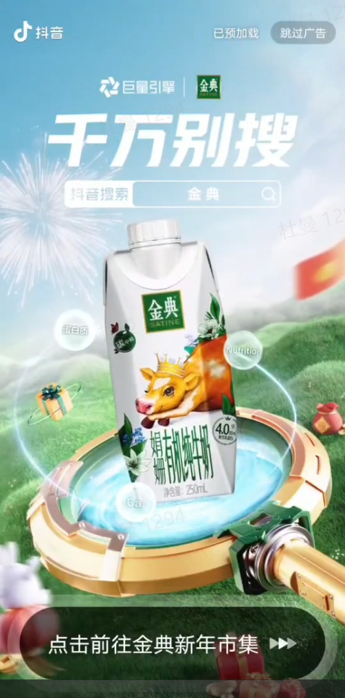 不少用户发现,1月5日当天,在抖音上搜索“金典”、“用金典致最爱”等关键词,就会触发特殊彩蛋:一个搜索的放大镜从屏幕中央突然幻化浮现,吸引人们的视线穿越万花筒般的华丽隧道,金典娟姗有机奶在通道尽头跃然而出,瓶身周围花草萦绕,绿色自然的清新之风扑面而来。这种炫酷的视觉动效与常规视频广告相比,画面更具惊喜感与冲击力,紧抓用户注意的同时,也更容易留下难忘记忆。