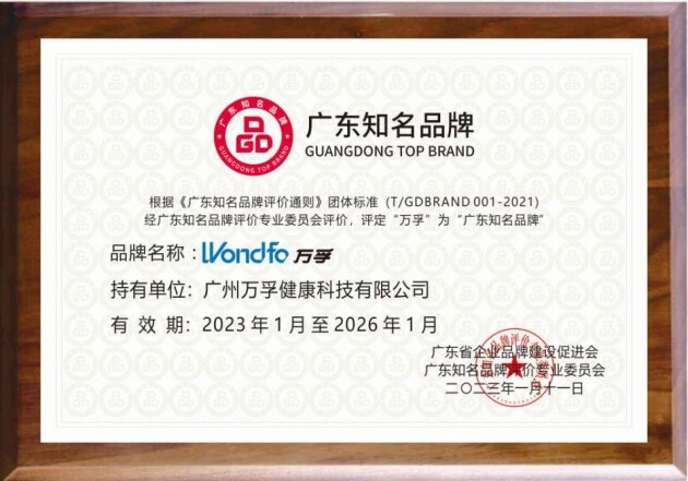 2023年1月11日,主题为“新时代 新品牌”的第三届2023品牌强国先行论坛在广州珠江宾馆隆重召开,大会举行第四批“广东知名品牌”颁牌仪式,万孚品牌荣获广东知名品牌。前几批获评的“广东知名品牌”包括立白、喜茶、双喜、金秀儿、蒙娜丽莎、秀儿等众多知名品牌。由广东省品促会联合多方专业机构针对广东企业共同开展的“广东知名品牌”评价,是广东品牌领域极具权威性、专业性和广泛性的一个综合性品牌评价活动,是广东品牌争创国际领先、消费者信赖、文化鲜明的创新实践。