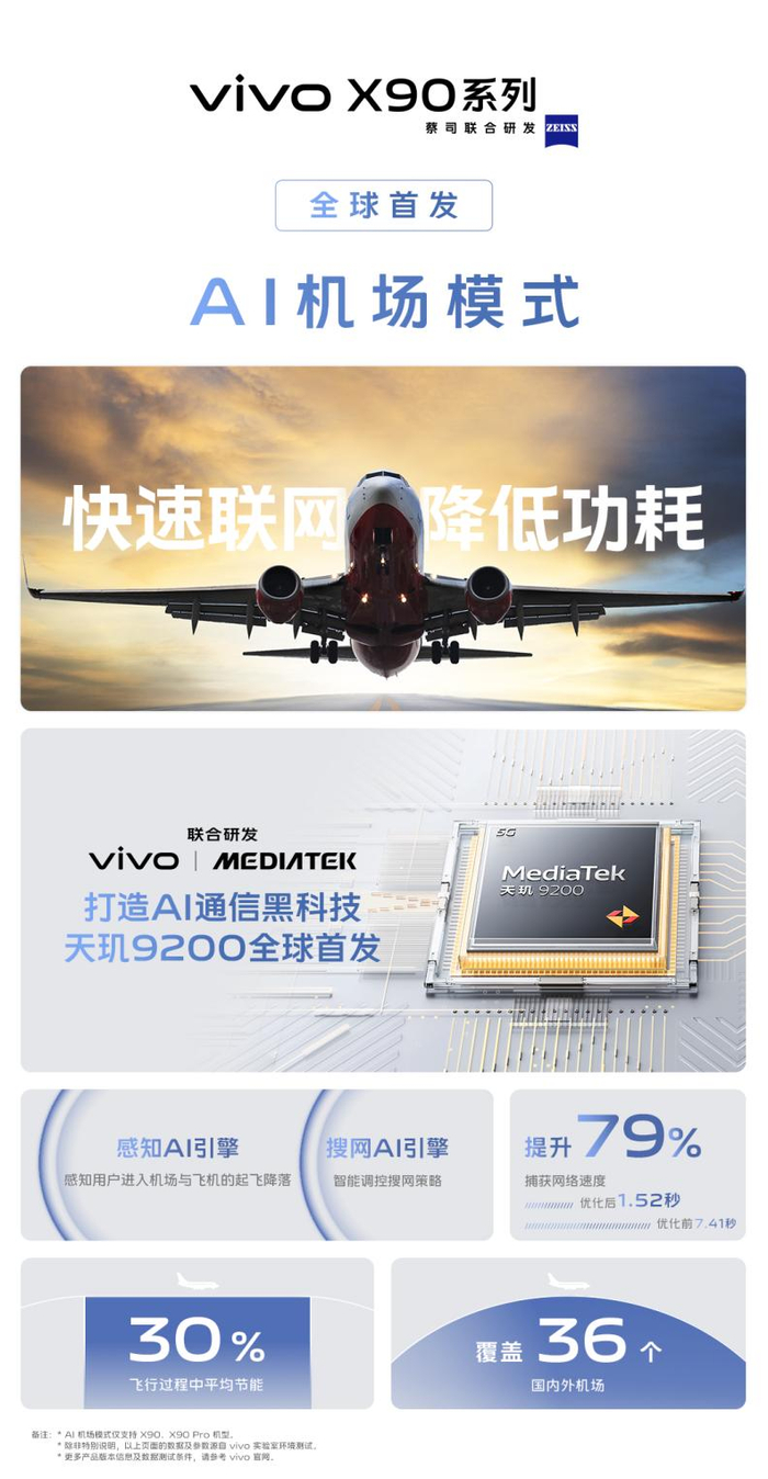 在X90和X90 Pro上,开启AI机场模式,可在用户乘机飞行期间实现平均节能30%;关闭飞行模式后,捕获网络的速度,优化前是7.41秒,优化后是1.52秒,时间缩短了79%。也就是说,飞机落地关闭飞行模式后,只需1.52秒就能上网冲浪了。目前,该功能共覆盖36个国内外机场。