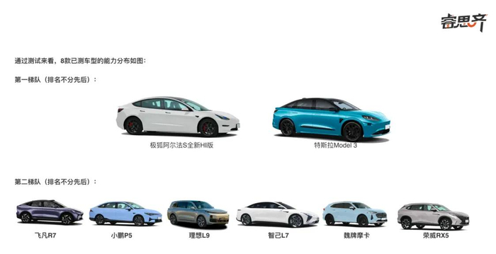 结果显示,依据本次的测试指标,极狐阿尔法S HI版(42.99w)、特斯拉Model3(26.67w)属于第一梯队,理想L9(45.98w)、智己L7(40.88w)、飞凡R7(32.25w)、魏派摩卡(23.88w)、小鹏P5(22.59w)、荣威RX5(15.99w)为第二梯队。
