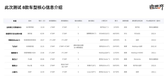 近日,智能汽车评测机构睿思齐联合汽车科技媒体Autolab发布了《高阶智能领航辅助驾驶(高速公路)发展报告2022》(以下简称“报告”)。报告汇集2022年国内市场上主流智能车型,选取了理想L9、飞凡R7、魏派摩卡、特斯拉Model3、小鹏P5、极狐阿尔法S HI版、智己L7、第三代荣威RX5 8款车型,通过3大项测试17小项测试,集中测评了各车型高阶智能领航功能。