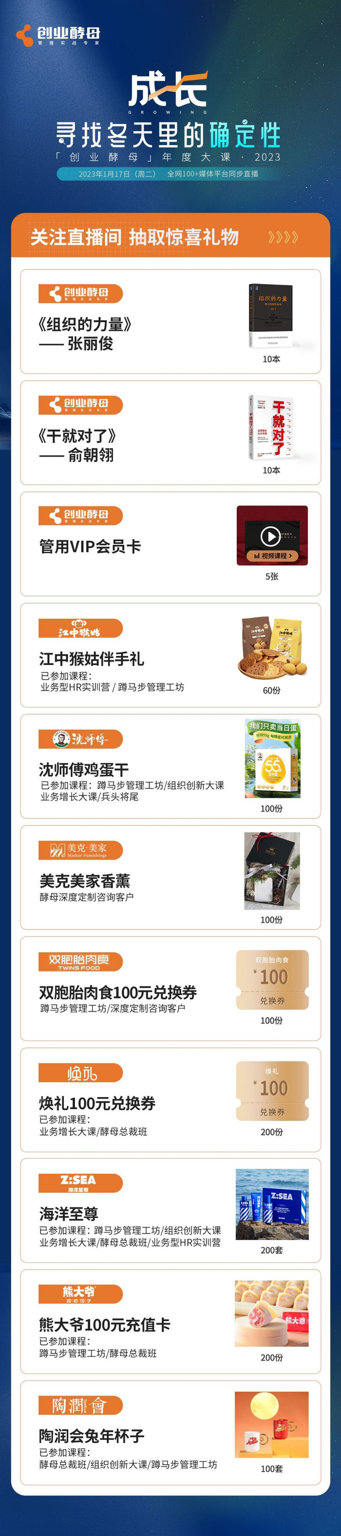 感谢这些合作伙伴提供了创业酵母年度大课期间的奖品支持!大家可以关注创业酵母“张丽俊”视频号,参与年度大课,抽取精彩好礼!