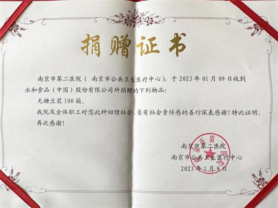 正值岁末年初的关键阶段,人口流动加大,医务工作者们任务繁重,孤寡老人、困境儿童等弱势群体也正面临更大的威胁。了解到这一现状,永和食品公司迅速响应社会号召,积极调配物资。一箱箱爱心豆浆粉送达南京市慈善总会,并陆续分发至南京市第二医院、南京市明基医院、南京市点将台福利院、南京市祖堂山社会福利院、南京市顶山街道社工站以及南京市江东街道社工站,为医务工作者、孤寡老人、困境儿童们送去了新年的暖心关怀。营养健康的暖心豆浆为大家补充植物蛋白,提高免疫力做出了积极的贡献。