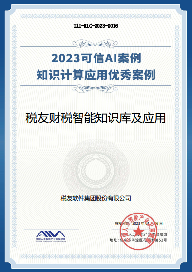 2023年1月11日,在中国人工智能产业发展联盟的指导下,中国信息通信研究院、AI工程化推进委员会知识计算工作组公布了“2023可信AI案例知识计算应用优秀案例”名单,税友集团研发的”税友财税智能知识库及应用“成功入选,在创新性和实践应用上获得了评选组的认可。