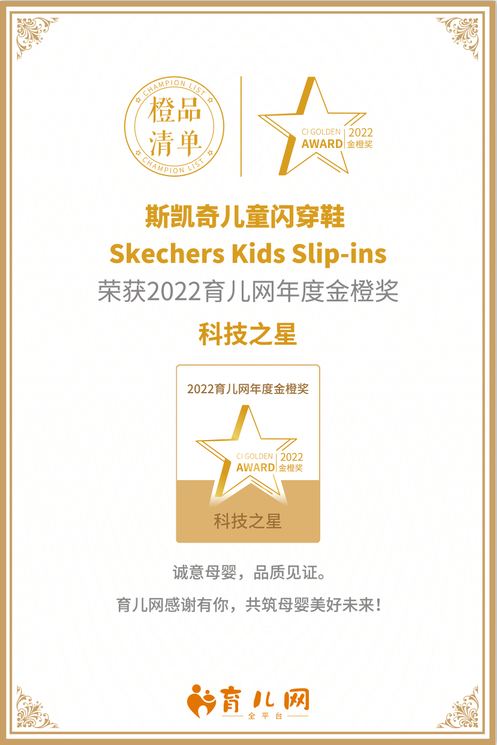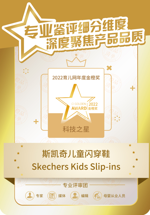“年度金橙奖”由母婴专业媒体育儿网发起,凭借多年在母婴领域的媒体观察经验,奖项评选受到广泛的业内和大众认可。在母婴产业专家、一线从业人员、媒体编辑的票选下,斯凯奇儿童闪穿鞋 Skechers Kids Slip-ins凭借“闪穿科技”成为“黑马产品”,拿下本年度金橙奖“科技之星”的称号,该奖项是母婴行业圈层对斯凯奇在儿童产品方面的创新科技和卓越品质的肯定。