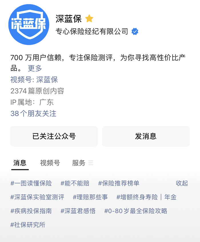 公众号作为深蓝保的根基,是投入最多资源的平台,内容形态丰富,打造了十多个精品栏目,基本覆盖了保险相关的所有内容。同时,深蓝保今年也重启了视频号的运营,内容更加多样化。毕竟,相较于抖音、快手等平台,视频号依托微信生态具有强大的社交属性,在建立私域流量池方面有天然优势。