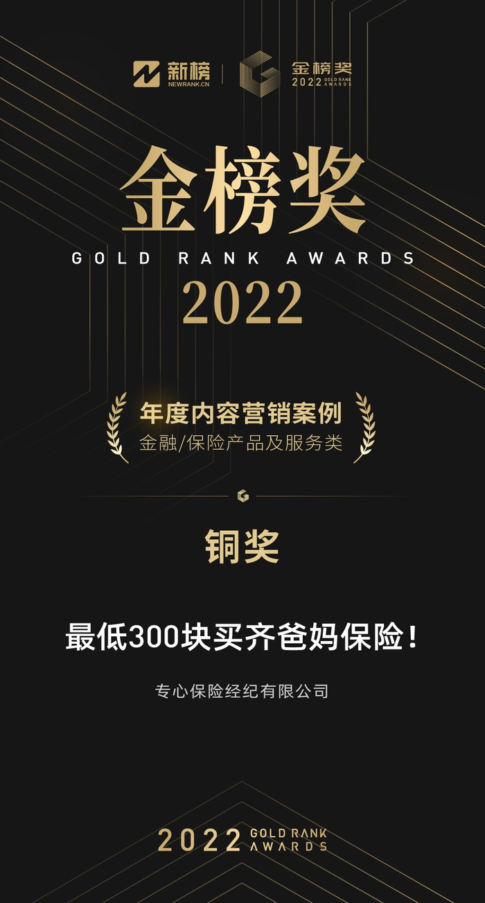 金榜奖由国内领先的内容产业服务平台新榜主办,旨在甄选运用社交网络进行品牌或电商推广的优秀案例,表彰行业机构和创意团队,深度挖掘内容价值。深蓝保此次获奖的案例为b站视频《最低300块买齐爸妈保险》。