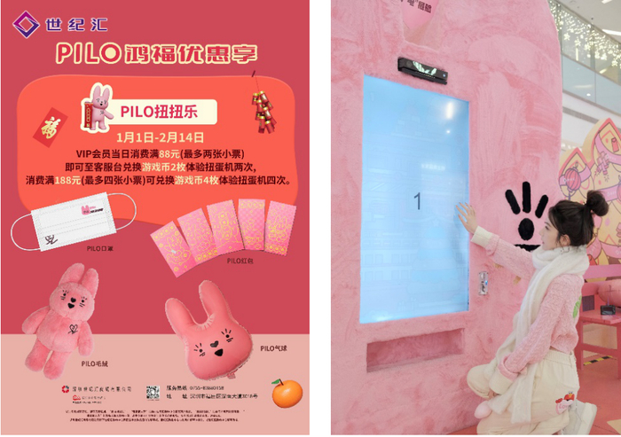 除此之外,世纪汇推出的 “PILO·体感扭扭好运站”继续为您送上红红火火的鸿运,消费满额即可赢得PILO同款新年好礼,包括PILO同款玩偶公仔、口罩、红包及可爱气球。世纪汇VIP会员凭消费88元即可扭两次,满188元可扭四次。PILO公仔陪您兔年“兔”个快乐又吉祥!
