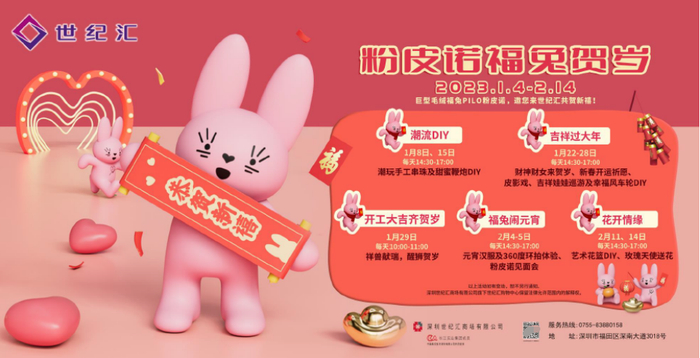 深圳世纪汇喜迎福兔新春!即日起,萌萌的“PILO粉皮诺”家族辞旧迎新以热烈而浓厚的年味儿亮相深圳世纪汇,约3.5米高巨型粉萌兔PILO、逾6米高闪耀礼盒许愿树,诚邀光临世纪汇,为新年祝愿,开启喜气洋洋的新年狂欢派对。多只毛绒软糯的粉PILO浪漫幸福登场,期待与您及挚爱共度新春。活动期间,世纪汇将上演财神财女巡游贺岁、新年开运祈愿、舞龙舞狮等一系列春节送福活动,还有“PILO接鸿福享轻餐饮现金券”、消费满额兑换限量版萌兔PILO利是封等超多优惠,福利升级,惊喜不断,满分开年。更有财神醒狮祝愿市民万事如意、龙马精神、百业兴旺、笑口常开。感受浓浓的春节仪式感,尽在《PILO 粉皮诺 - 福兔贺岁》新春派对。