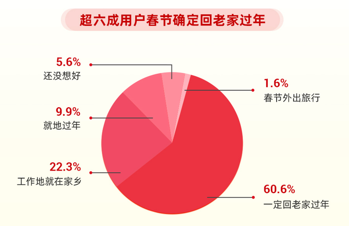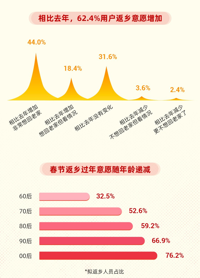 据统计,超六成受访用户春节确定回老家过年,这一比例比去年春节增加10%。此外,62.4%的用户认为兔年返乡意愿相比虎年有所增加,其中44%“非常想回家过年”。报告指出,用户春节返乡过年意愿随年龄递减,不少大龄用户因为在外乡安家,回乡意愿降低。“60”后返乡用户占比仅32.5%,“90后”“00后”则分别达到66.9%和76.2%。