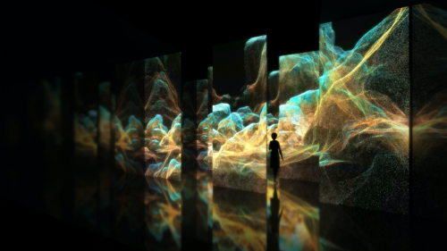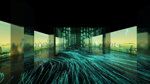置身画境万千之中,千年前的一抹青绿幻化为千年后的山水奇境。徜徉其间,品读山间四时美景,高崖飞瀑近在咫尺,屋舍长桥触手可及。霎那间,这幅理想世界的缩影又幻化为一场声、光、影完美交融而成的“律动江山”感官盛宴。“律动江山”分为入境、寻境、化境三个部分,并将千里江山图中的元素结合音乐与空间进行了二次创作。曾经的天才少年希孟仿佛穿越千年,来到我们面前,他将在这个书画幻境空间中绘就怎样的全新《千里江山图》卷?