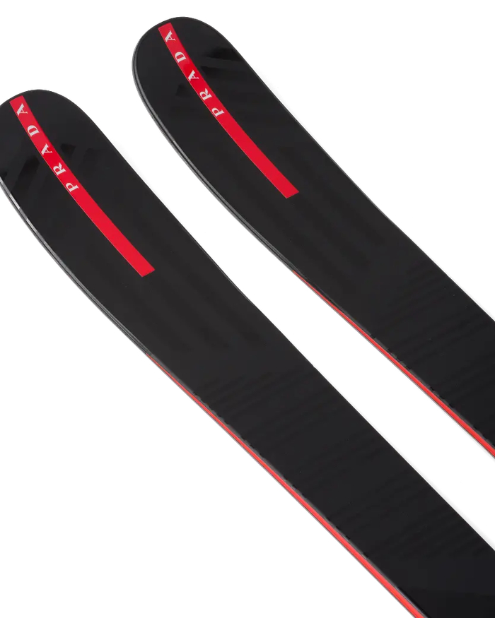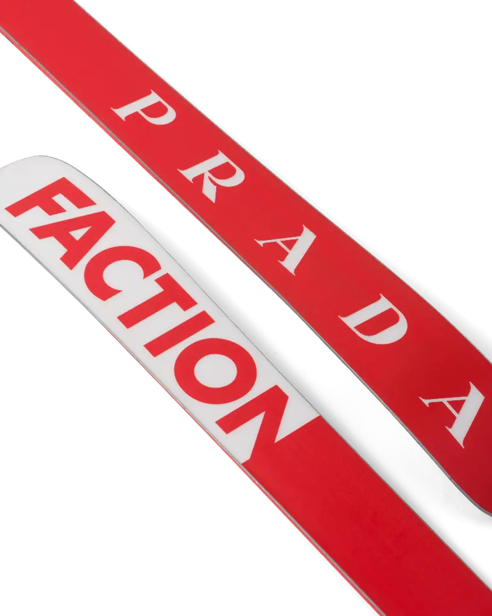 FACTION x PRADA Linea Rossa Prodiy 1.0滑雪双板为全山地双向板头设计,专为滑雪道和滑雪场内下坡滑行打造,此款多功能滑雪板适合中级及高级水平者使用。板底是标志性的FACTION品牌LOGO以及Prada经典红底LOGO,板面以黑色为主色调。