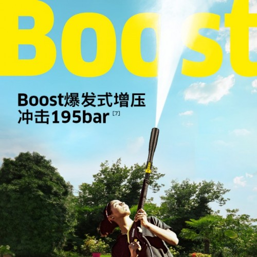 面对超顽固污渍,卡赫K 7可启动瞬时增压功能,长按枪柄上的“+”按钮,直到显示屏上Boost亮起,即可开启增压档位,在峰值压力180bar的基础上,爆发式加压15bar,瞬时增压至195bar超高压力,30秒持续强悍高压冲洗,除污更轻松。