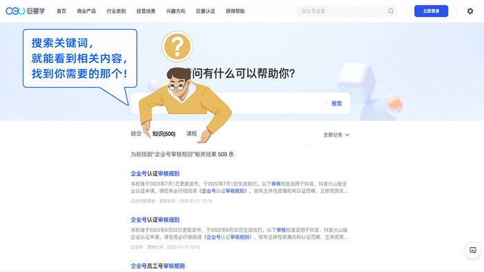 “我想知道企业号申请规则怎么搜”、“我想知道小店随心推的投放规则”,面对这样有明确问题的用户,「巨量引擎帮助中心」借助标准化的内容及业务接入,配备了在聚合页面直接搜索答案的能力,用户无需进入各商业产品帮助站点,就能够直接获取搜索结果。简化搜索流程,在保证内容质量的同时,也降低了沟通成本,提升用户查找帮助内容的效率,带问题直达答案。