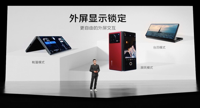 当然,具备悬停功能的折叠屏手机玩法更多,比如悬停拍照、悬停视频等。三星Z Fold4和vivo X Fold+就可以把手机放在桌子上停在一个合适的角度进行自拍。同时,依托于悬停功能,vivo X Fold+还可以实现一系列独特的交互体验:在WPS软件上,vivo X Fold+支持演讲者模式,悬停状态下的X Fold+上面是PPT、下面是备注,并且可以通过WiFi直接投屏,使用感受无限趋近与笔记本电脑。悬停通话、悬停观影等功能更是可以帮助用户解放双手;另外,vivo X Fold+的外屏显示锁定支持帐篷模式、屏风模式和台历模式,为用户带来一用难回的使用体验。
