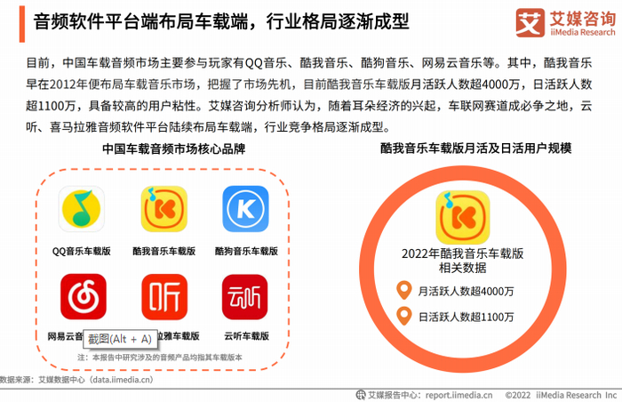据了解,除了喜马拉雅等音频平台,QQ音乐、酷我音乐、酷狗音乐、网易云音乐等音乐平台也都对车载端音频加强布局,在内容、产品双端发力,在车载音频市场举重若轻。其中,酷我音乐把握市场先机,早在2012年便提前布局,并成立酷我车载声音实验室,加大技术端投入,使得酷我音乐车载版各项数据在车载音频市场都表现突出。截至目前,酷我音乐车载版市占率达到80%,最新用户量达7500万;月活人数超4000万,日活超1100万。