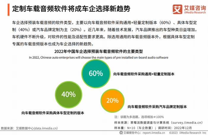 汽车预装是车载音频产品获取用户的重要渠道,艾媒咨询《中国车载音频行业发展年度研究报告》对车企需求也进行了深入洞察。报告显示,定制车载音频软件将成为车企选择新趋势,车企选择预装车载音频软件类型,60%向车载音频软件采购通用+轻量定制版本,40%采取具体车型定制方式,20%采取汽车品牌定制方案。而车企选择合作音频软件最关注的因素主要有品牌影响力、匹配度、技术能力、音频资源。