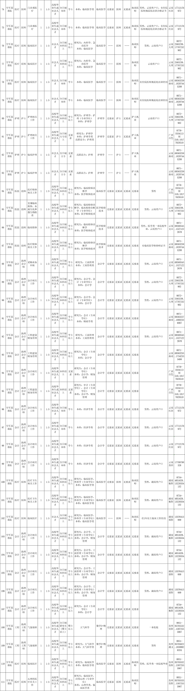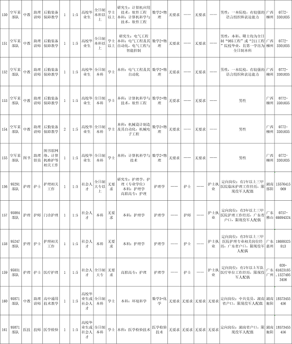 2023年南部战区空军面向社会公开招考岗位165个,工作地点覆盖广东、广西、湖南、云南、贵州5省(区)多个主要城市,岗位类别覆盖管理岗和工程、医疗、会计、教学等专业技术岗。