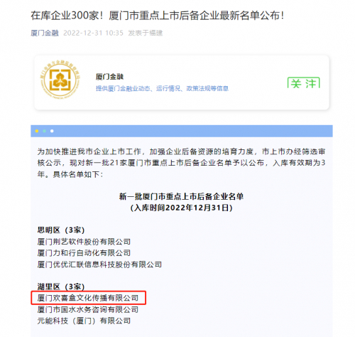近日,厦门市地方金融监督管理局(市上市办)公布了新一批厦门市重点上市后备企业名单,厦门欢喜盒文化传播有限公司(简称:欢喜盒)等21家企业顺利入选。