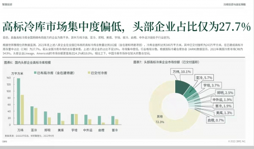 根据CBRE对主要城市冷库的数据监测和评估,全国高标冷库(按照国际标准设计建造,或以高标干仓、厂房参照专业标准改造的冷库)合计面积为876万平方米,在中国冷库总存量中占比不足1/3,市场上的存量冷库,依然以传统农批市场农民仓为主。具备高标冷库全国网络布局能力的头部企业占比仅为27.7%,其中处于行业前列的万纬冷链占比约为10.1%,中国冷库市场存在较大的整合空间。