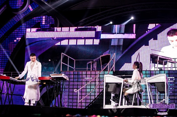 北京电子键盘音乐节“超级指尖秀”开幕式中,原艺与王小玮合奏的《黑白狂想曲》作为压轴节目展现给现场观众,成为整场音乐会最精彩的表演。原艺携6台音乐合成器率先弹奏起来,节奏逐渐加快,反复渐进的方式描绘了古代战场中士兵列战、鼓声争鸣的壮观场景。王小玮紧随其后,指尖快速的敲击着每一个琴键,将一场兵戎相见、人仰马翻的世纪大战呈现于观众面前。演奏完毕,主持人王为念打趣的说到:我仿佛看到了两口子在家打架的场景。