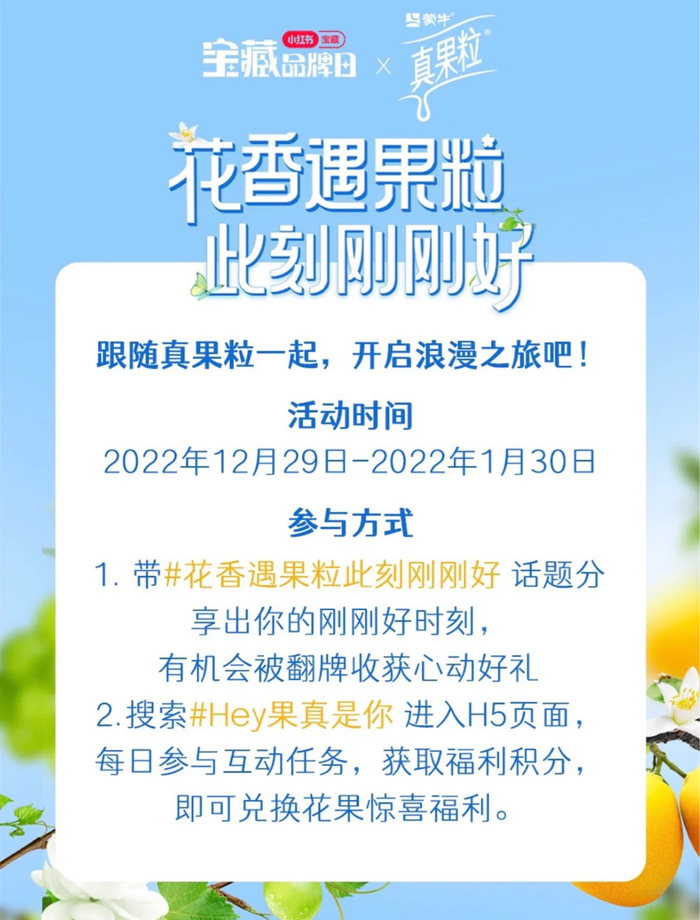 为了陪伴小红薯们抓住生活中更多「刚刚好」美好瞬间,蒙牛真果粒也选择牵手小红书,作为「宝藏品牌日」IP的首个合作品牌,发起「花香遇果粒此刻刚刚好」活动。搜索话题#花香遇果粒此刻刚刚好即可进入活动页面,完成打卡任务,包括浏览真果粒官方的账号、活动话题页,或是搜索“Hey果真是你”、晒出自己的刚刚好一刻故事等,便能获得相应积分,兑换心仪的奖品!