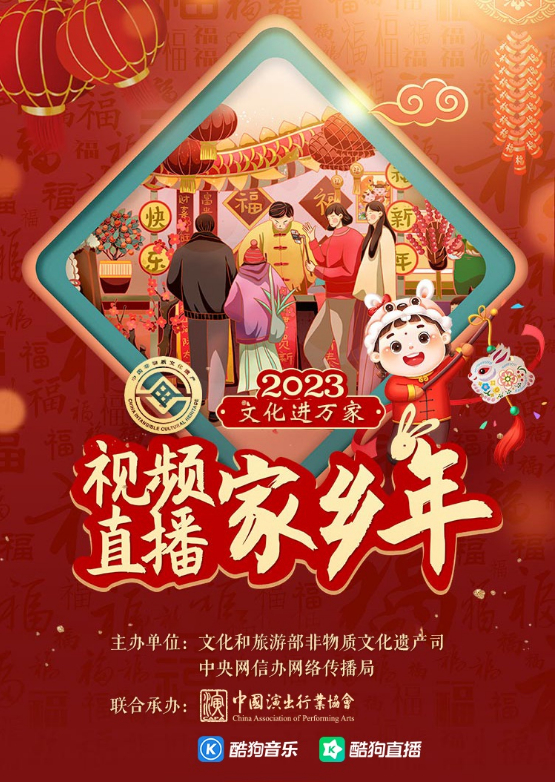 为丰富人民群众精神文化需求,打造红火、热闹的网络中国年氛围,2023年1月14日,由文化和旅游部非物质文化遗产司、中央网信办网络传播局主办,中国演出行业协会联合酷狗音乐、酷狗直播等平台承办的“2023文化进万家——视频直播家乡年”活动正式启动。