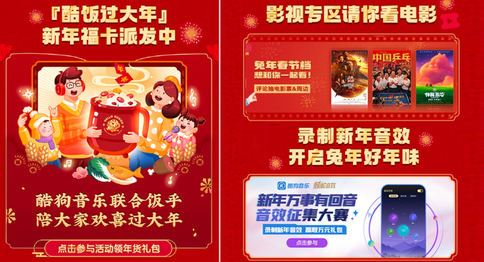 在2023年春节到来之际,酷狗音乐携手美食品牌饭乎联合打造了“酷饭过大年,干饭人的共同选择”春节企划,不仅有“年夜饭 听歌指南”,还能玩音乐游戏、分享兔年福卡,赢取限量年货——酷狗大红“煲”。让人们在音乐带来的节日气氛中,传递新春祝福;在味觉和听觉的融合中,感受烟火气和人情味。