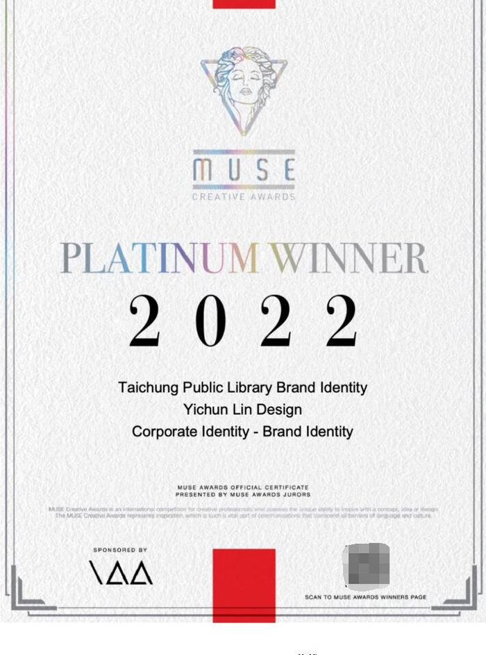 她的获奖作品‟台中市立图书馆形象识别系统”在MUSE Creative Award大放异彩,获得白金奖的殊荣。MUSE Creative Award为纽约International Awards Associate (IAA)的项目之一。作为最具影响力的国际奖项之一,MUSE Creative Award旨在发掘更多充满创意及概念的设计。