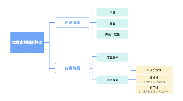 一条优质素材需要在具备内容价值的同时保障声画质量。从内容价值角度上看,信息主体要清晰明确, 所传递出的信息除了需要有正向的价值观,对用户来说还应该具备趣味性或者有用性;在声画质量角度,需要优质的声音和舒适的画面,加上良好的声画一致性,这些都是带给用户良好观感体验的要点。