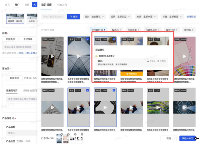另外,平台对于低效素材(即系统评估视频素材已充分探索但跑量效果极低,且预估未来不起量的素材) 也会提示「低效素材」标签,对极端使用低效素材的计划进行拦截,并建议广告主、代理商替换为新素材或历史跑量较好的素材。广告主应摆脱低效素材,做好轻装上阵的“减法”,实现整体效能优化。