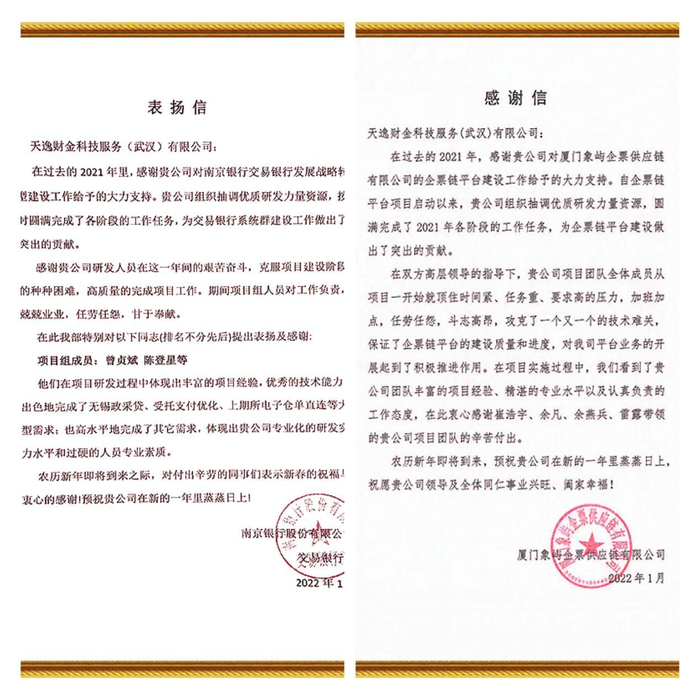 2月,天逸集团收到来自浦发银行、南京银行、象屿集团的感谢信,对天逸一年来与合作伙伴共克时艰、高效保供表示感谢。