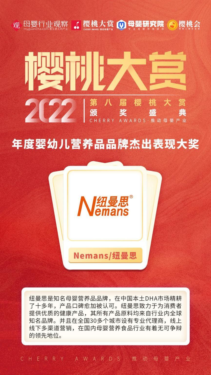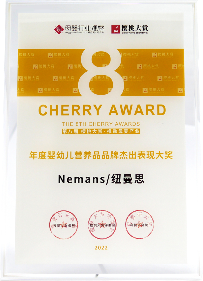 近日,由行业权威媒体母婴行业观察发起的“樱桃大赏”评选活动正式举办,旨在于众多母婴品牌中发掘未来领袖,表彰母婴行业标杆。在经过一众品牌的激烈角逐后,纽曼思成功摘得“年度婴幼儿营养品品牌杰出表现大奖”。