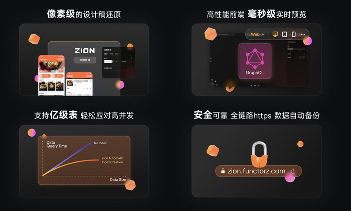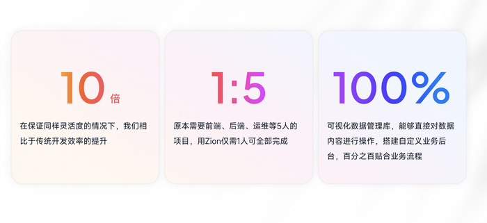 「Zion」是一个全场景的无代码云开发工具,帮助用户完成页面、业务逻辑和数据模型的可视化设计,从而显著降低跨平台应用开发的技术门槛;设计完成后,通过代码生成、应用部署以及发布上线,实现从设计到交付的完全自动化,从而达到超过10倍的开发效率提升。目前Zion支持小程序、H5、PC等多端应用开发,已服务新零售、工业制造、金融科技等领域数百个应用场景,包括招商银行、欧莱雅、OPPO、西贝等数万家企业和用户。