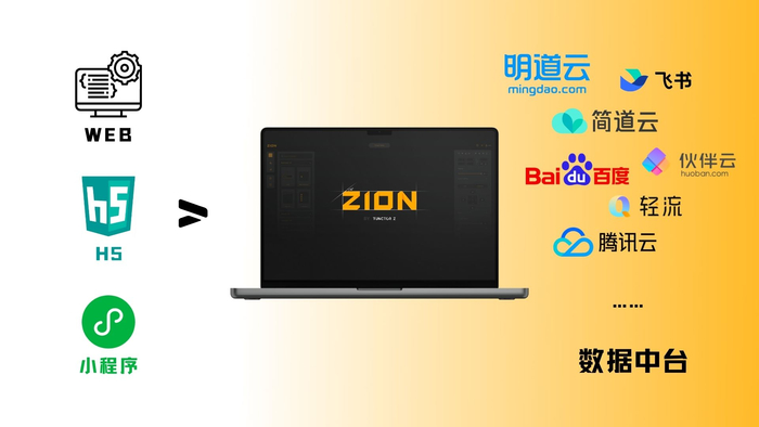 Zion以近乎100%还原前端设计稿、以及强大的Api对接能力,能够实现基于飞书、明道云、简道云或者企业内部数据中心等数据中台,灵活地制作微信小程序、桌面端网页,移动端h5等多种场景的应用。